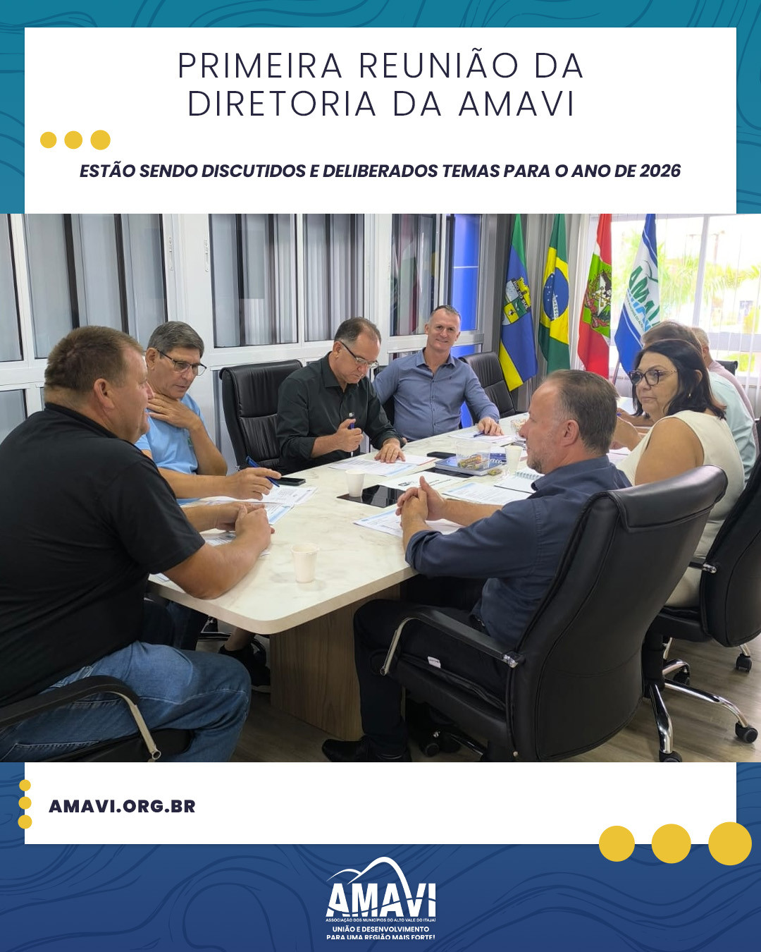 Os prefeitos que integram a diretoria da AMAVI estão reunidos nesta manhã, na primeira reunião do grupo do 2026. Com uma pauta extensa, estão sendo discutidos e deliberados temas como o planejamento para o ano, prestação de contas, avaliação de desempenho, calendário de assembleias, demandas de serviços de engenharia entre outros.
