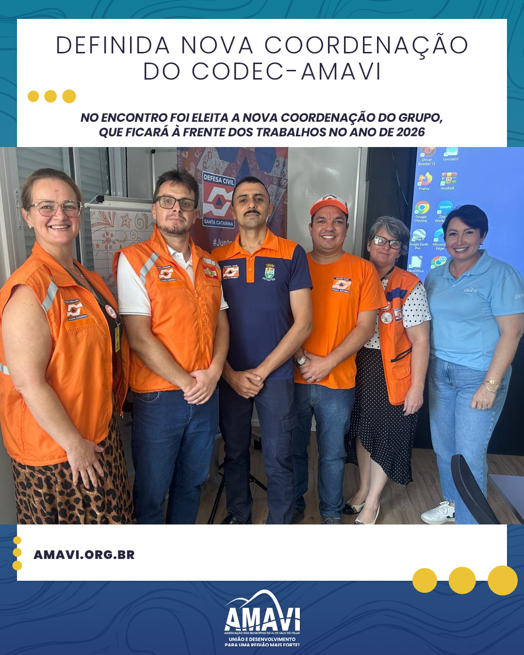 Na manhã de hoje, 28, foi realizada reunião ordinária do Colegiado de Defesa Civil dos Municípios da AMAVI (CODEC-AMAVI). No encontro foi eleita a nova coordenação do grupo, que ficará à frente dos trabalhos no ano de 2026, ficando assim constituída:Coordenador Geral: Hipólito Sardá de Souza de Braço do...CINTETUR define coordenação para 2026