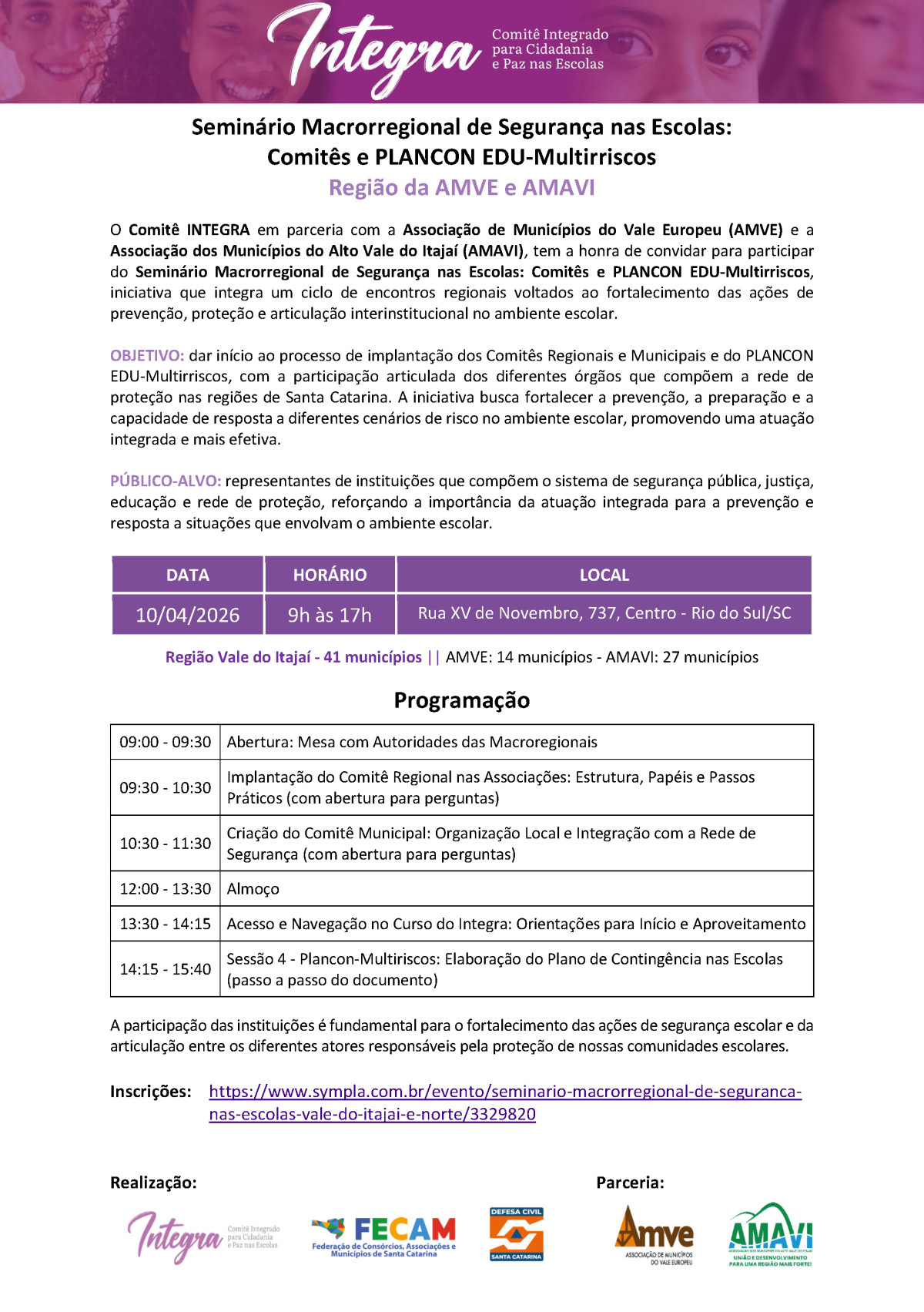 Local: Auditório da AMAVI - Rua XV de Novembro, 737, Centro Rio do Sul/SC