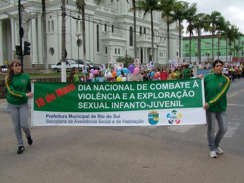 Hoje, 18 de maio, é o dia nacional de combate ao abuso e exploração sexual infanto-juvenil. Através de uma iniciativa do Fórum Catarinense pelo Fim da Violência e da Exploração Sexual Infanto Juvenil e prefeituras municipais, em diversos municípios do Alto Vale do Itajaí estão sendo realizadas mobilizações com o objetivo de informar e envolver a sociedade no enfrentamento desta violência considerada um crime grave.
