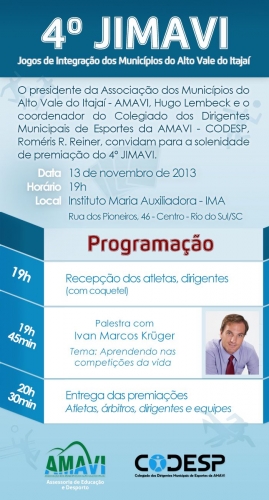 Na próxima quarta-feira, (13/11) , às 19 horas, no auditório do Instituto Maria auxiliadora- IMA, em Rio do Sul, será realizada a solenidade de encerramento e premiação do JIMAVI 2013– Jogos de Integração dos Municípios do Alto Vale do Itajaí. Além da entrega dos troféus e medalhas, haverá uma palestra sobre o tema: Aprendendo nas Competições da Vida.