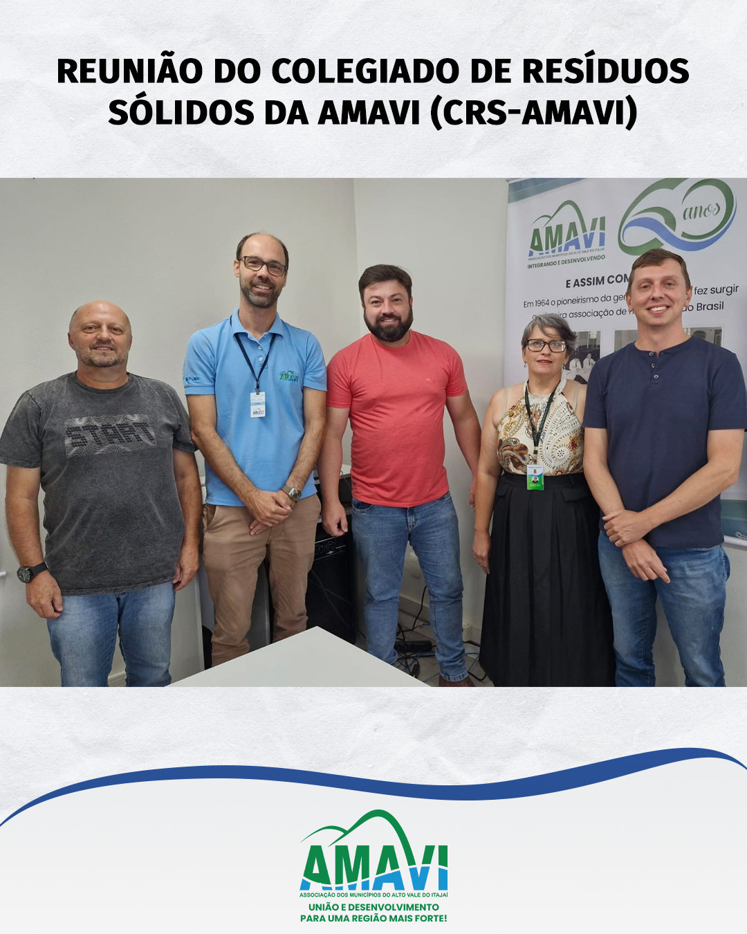 O Colegiado de Resíduos Sólidos da AMAVI, CRS-AMAVI, realizou ontem reunião ordinária. Foram discutidos temas com a realização de treinamentos e estudos de viabilidade e implementação do parque de processamento e tratamento de resíduos sólidos urbanos dos municípios da AMAVI. Também foi eleita a nova coordenação do colegiado para 2025, que ficou assim constituída: coordenador: Leandro Diferson Fernades - Vitor Meireles; vice-coordenador: Joabe Weber Pitz - Aurora; secretário: Adriana Konig Kipfer - Dona Emma; secretário adjunto: Denilson Novak - Rio do Campo e assessor técnico: Gabriel Soldatelli Murara da AMAVI.