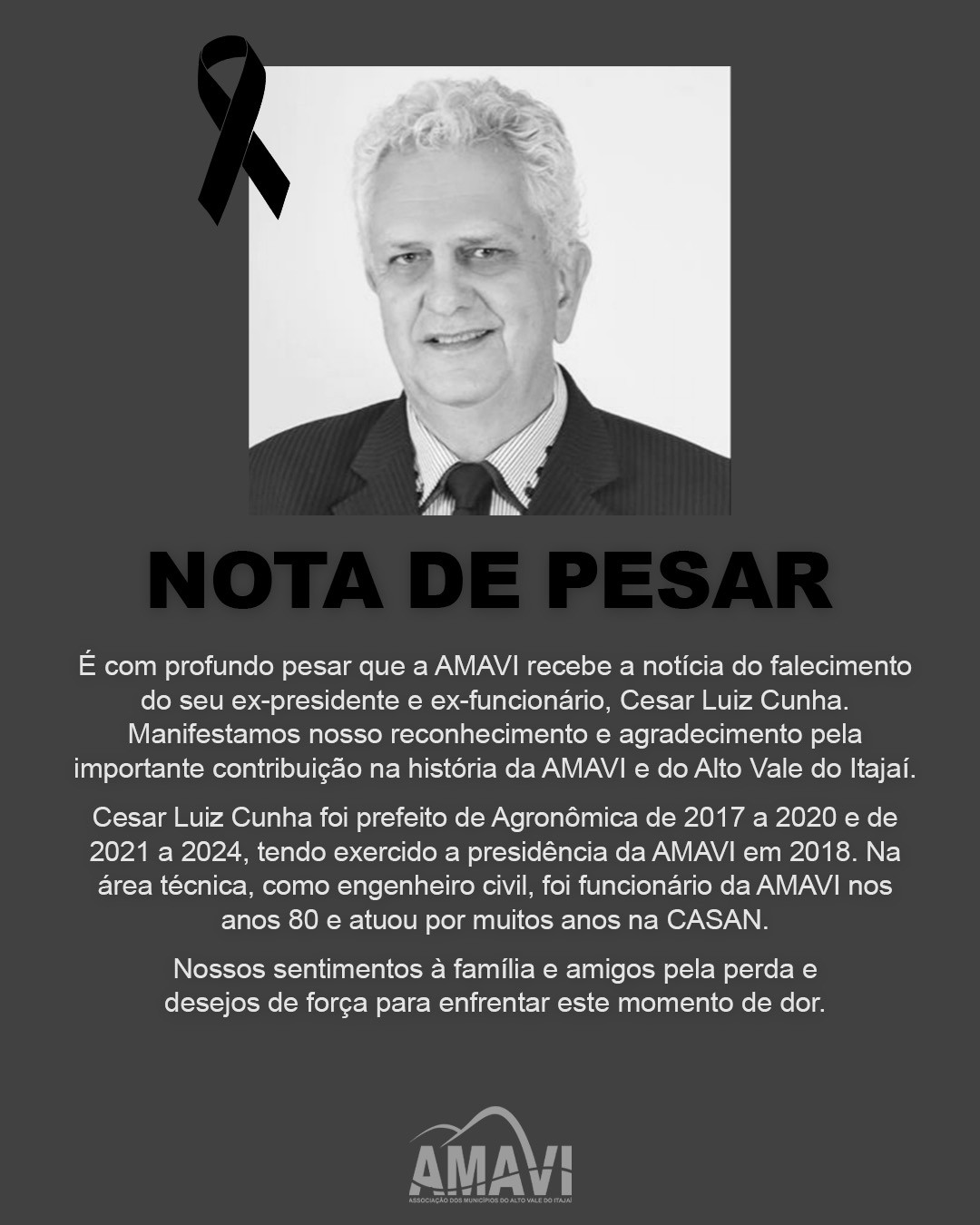 É com profundo pesar que a AMAVI recebe a notícia do falecimento do seu ex-presidente e ex-funcionário, Cesar Luiz Cunha. Manifestamos nosso reconhecimento e agradecimento pela importante contribuição na história da AMAVI e do Alto Vale do Itajaí.