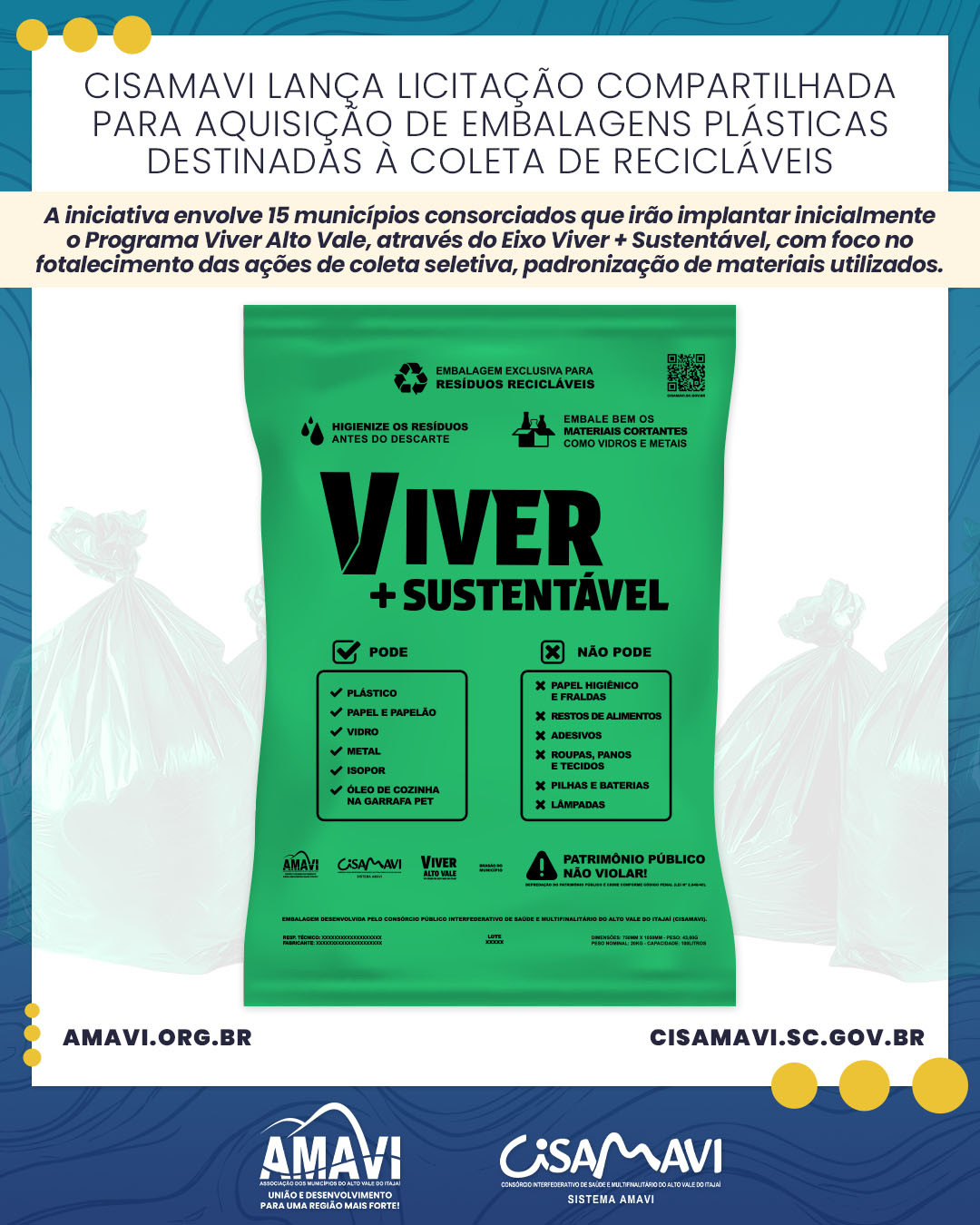 A iniciativa envolve 15 municípios consorciados que inicialmente irão implantar o Programa Viver Alto Vale através do Eixo Viver + Sustentável e tem como objetivo fortalecer as ações de coleta seletiva, padronizar os materiais utilizados e garantir maior eficiência logística e econômica aos municípios participantes. Ao todo, está prevista a aquisição de 1.566.876 embalagens plásticas, quantidade definida com base no levantamento e na previsão de demanda apresentada pelos próprios municípios, conforme as condições estabelecidas no edital.